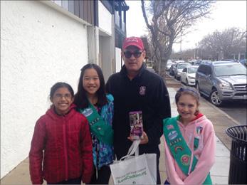 一位戴著棒球帽和墨鏡的先生,向 Los Altos 街上銷售餅乾的女童軍買了四盒餅乾,並額外捐了 20 美元。
